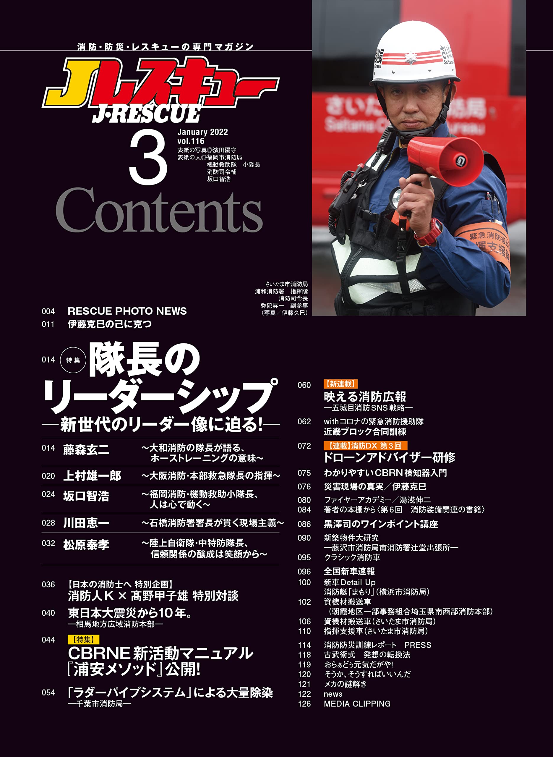 今号は待望の隊長特集! 消火、人命救助、災害対応という様々なミッションを遂行するために部隊を運用する「隊長」はどうあるべきか? 消火隊、レスキュー隊、救急隊、特殊災害対応など、様々な隊の隊長インタビューから、これからの時代に求められるリーダーシップ像をあぶり出した。