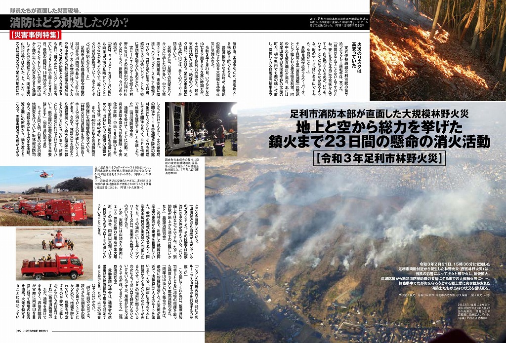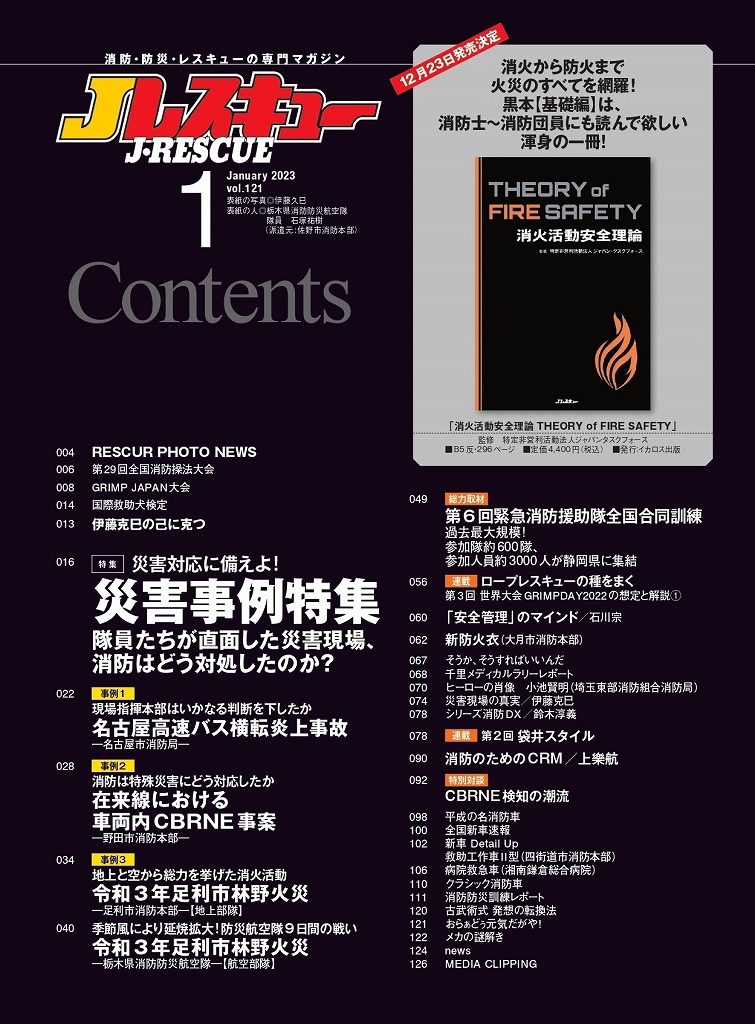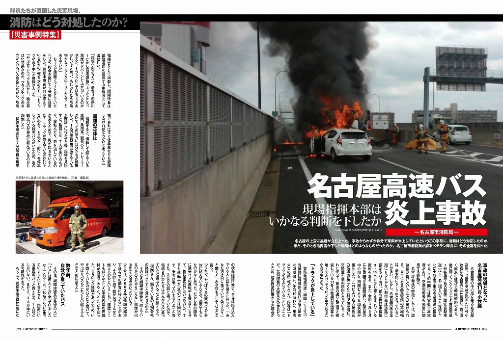 日々、全国各地で様々な形態の火災、救助、救急事案が発生している現代だからこそ、今号ではとりわけ最近、全国的なニュースにもなった高速道路での大型バスの炎上事故や、列車内の不審な液体の特殊災害事案、延焼拡大した足利の林野火災を取材した。