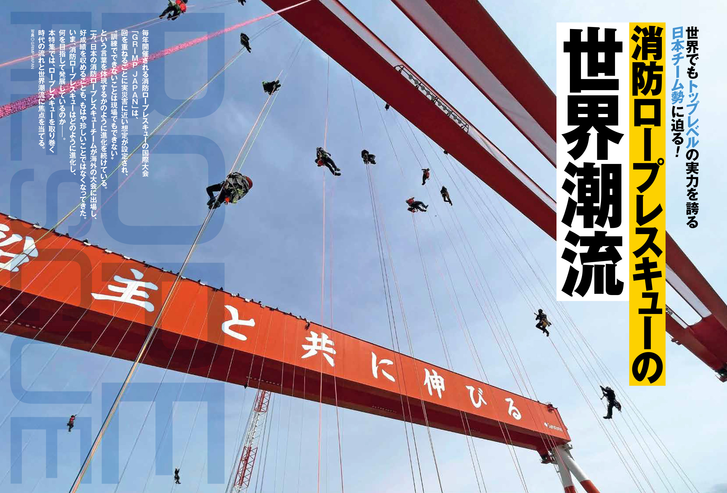毎年開催される消防ロープレスキューの国際大会「GRIMP JAPAN」は、回数を重ねるごとに実災害に近い想定が設定され、“訓練でできないことは現場でもできない”という言葉を体現するかのように進化を続けている。一方、日本の消防ロープレスキューチームが海外の大会へ出場し、好成績を収めることも、もはや珍しいことではなくなった。