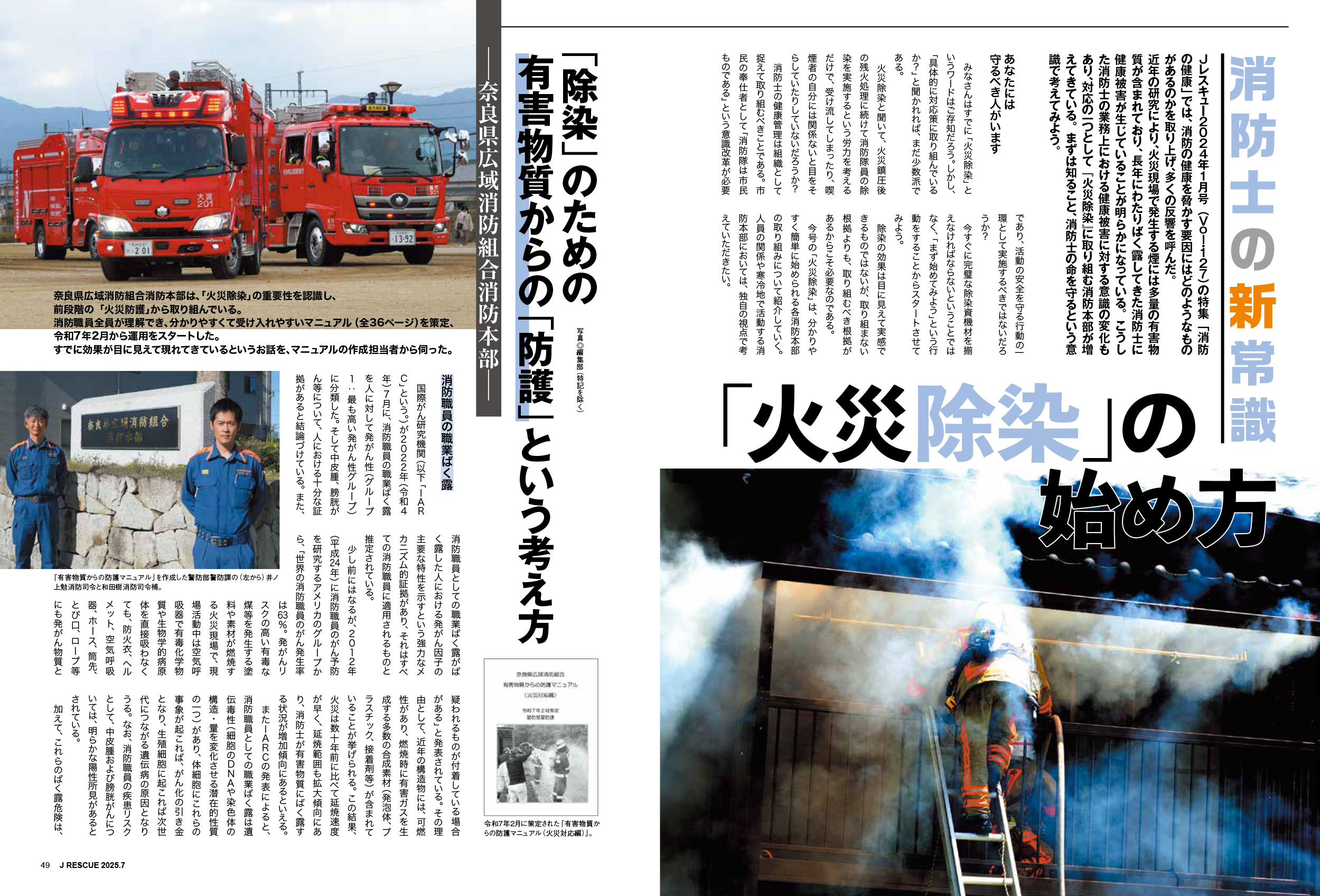 近年の研究により、火災現場で発生する煙には多量の有害物質が含まれており、長年にわたりばく露してきた消防士に健康被害が生じていることが明らかになっている。こうした消防士の業務上における健康被害に対する意識の変化もあり、対応の一つとして「火災除染」に取り組む消防本部が増えてきている。まずは知ること、消防士の命を守るという意識で考えてみよう。